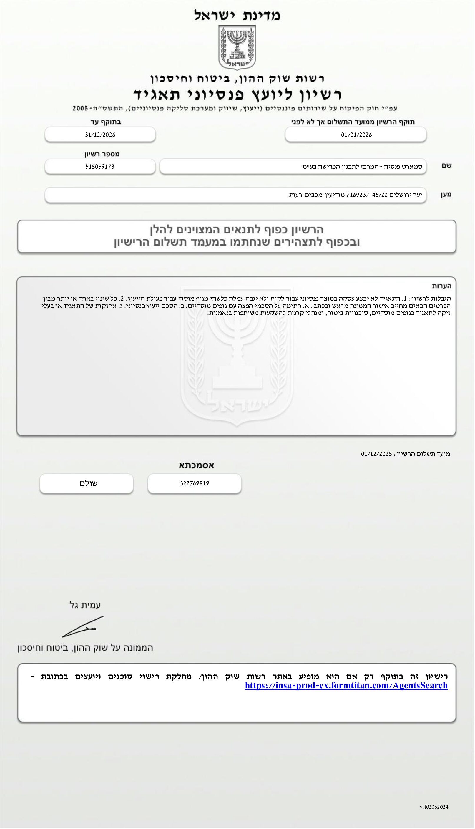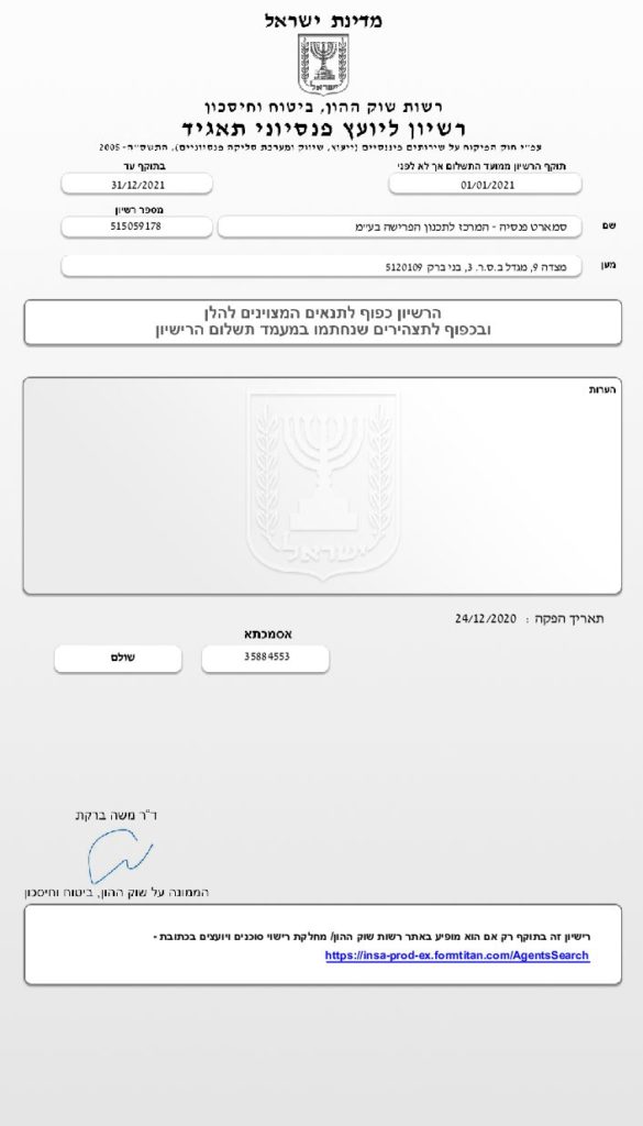 - רשיון ליועץ פנסיוני תאגיד – סמארט פנסיה – המרכז לתכנון הפרישה בע"מ